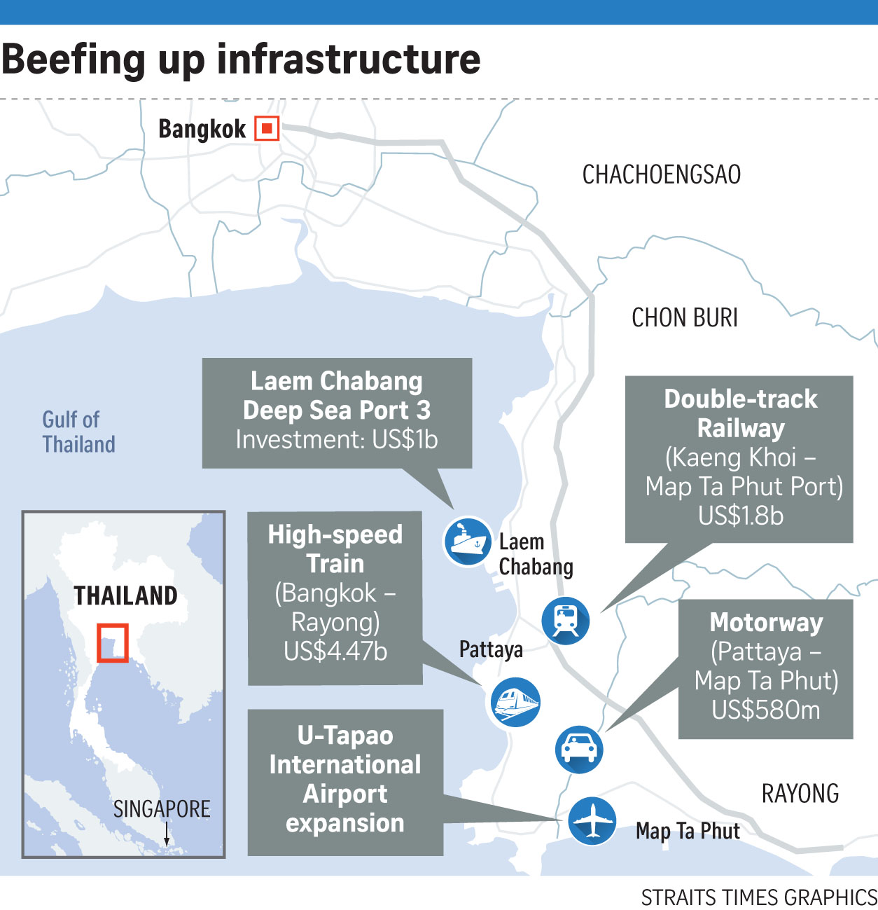 Le corridor économique situé au sud-est de Bangkok, et qui comprend notamment un port en eau profonde, un aéroport international, de nombreuses zones franches réservées à l’exportation et différents espaces industriels, pourrait bien être estampillé « Nouvelles routes de la Soie ». Ce plan chinois prévoit, notamment, de financer des projets d’infrastructures – terre et mer – partout en Asie. La Chine estime que cette zone de Thaïlande, sur laquelle se construisent de gigantesques ensembles résidentiels pourrait lui être utile, notamment par les connexions ferroviaires et le port. D’un montant total d’investissement estimé à 44 milliards de dollars d’ici à 2021