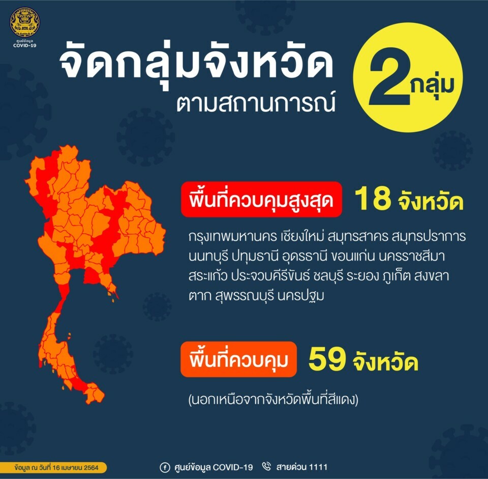 >Le gouvernement thaïlandais a déclaré les zones de contrôle les plus élevées dans 18 provinces, dont la région métropolitaine de Bangkok, et a mis en place des zones de contrôle élevées dans les autres provinces du pays, a annoncé cet après-midi, le 16 avril, Taweesilp Visanuyothin, porte-parole du CCLAT.