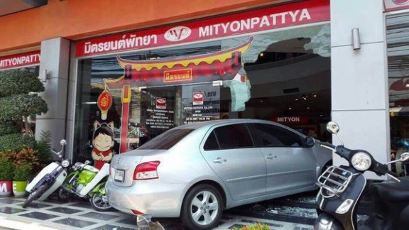 M. Michel Budons, 71 ans, et sa femme Apawan 67 ans, auraient déclaré à la police qu’ils rentraient à leur hôtel, après une séance de shopping dans le nord de Pattaya, lorsque M. Budons a soudainement perdu le contrôle du véhicule. Il aurait affirmé qu’il a pris l’accélérateur pour le frein, ce qui a eu pour conséquence d’emboutir la vitrine du showroom du magasin de motos Mityon dans le sud de Pattaya.